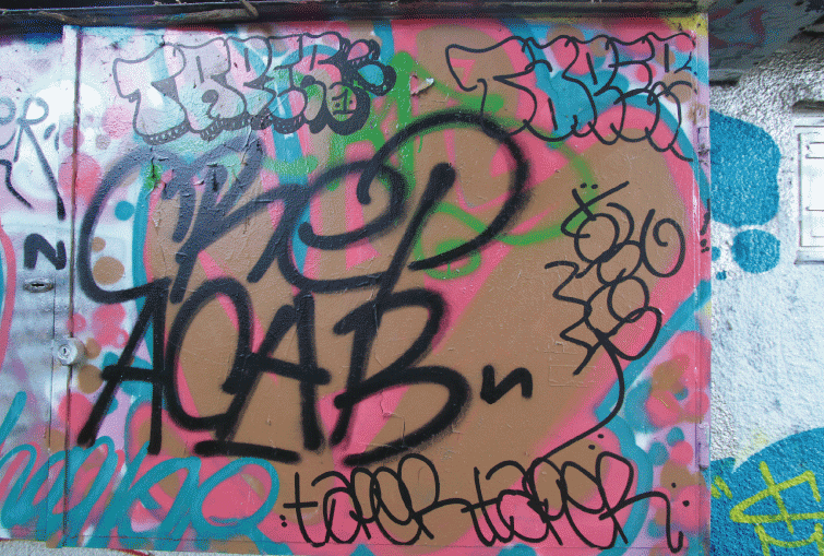 ドアや壁に描かれたタグやステッカーはカラフルな色彩が目立つ。沢山の色とスタイル。